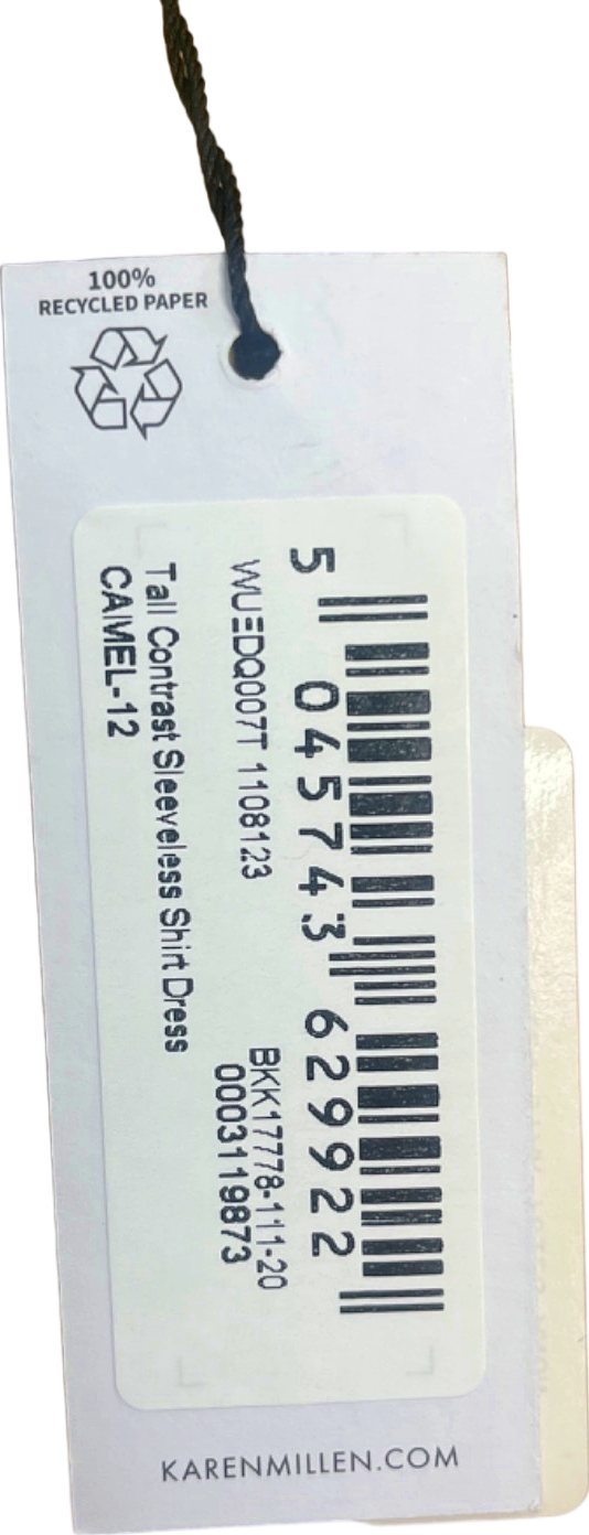 This elegant Karen Millen camel-colored sleeveless dress has a sophisticated style perfect for various occasions. It features a flattering button-down front with white piping details along the collar, seams, and edges, adding a chic contrast. The dress is made from high-quality materials, ensuring comfort and durability. Ideal for work or casual wear, this versatile piece is a must-have in your wardrobe.