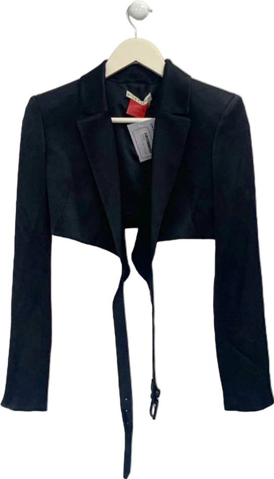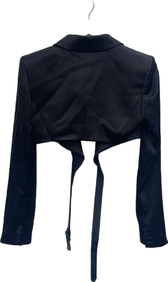 This Alice + Olivia cropped blazer in black is a sophisticated addition to any wardrobe. Designed with a modern twist, it features a sleek, open front with a unique fastening detail. Perfect for elevating both casual and formal outfits.