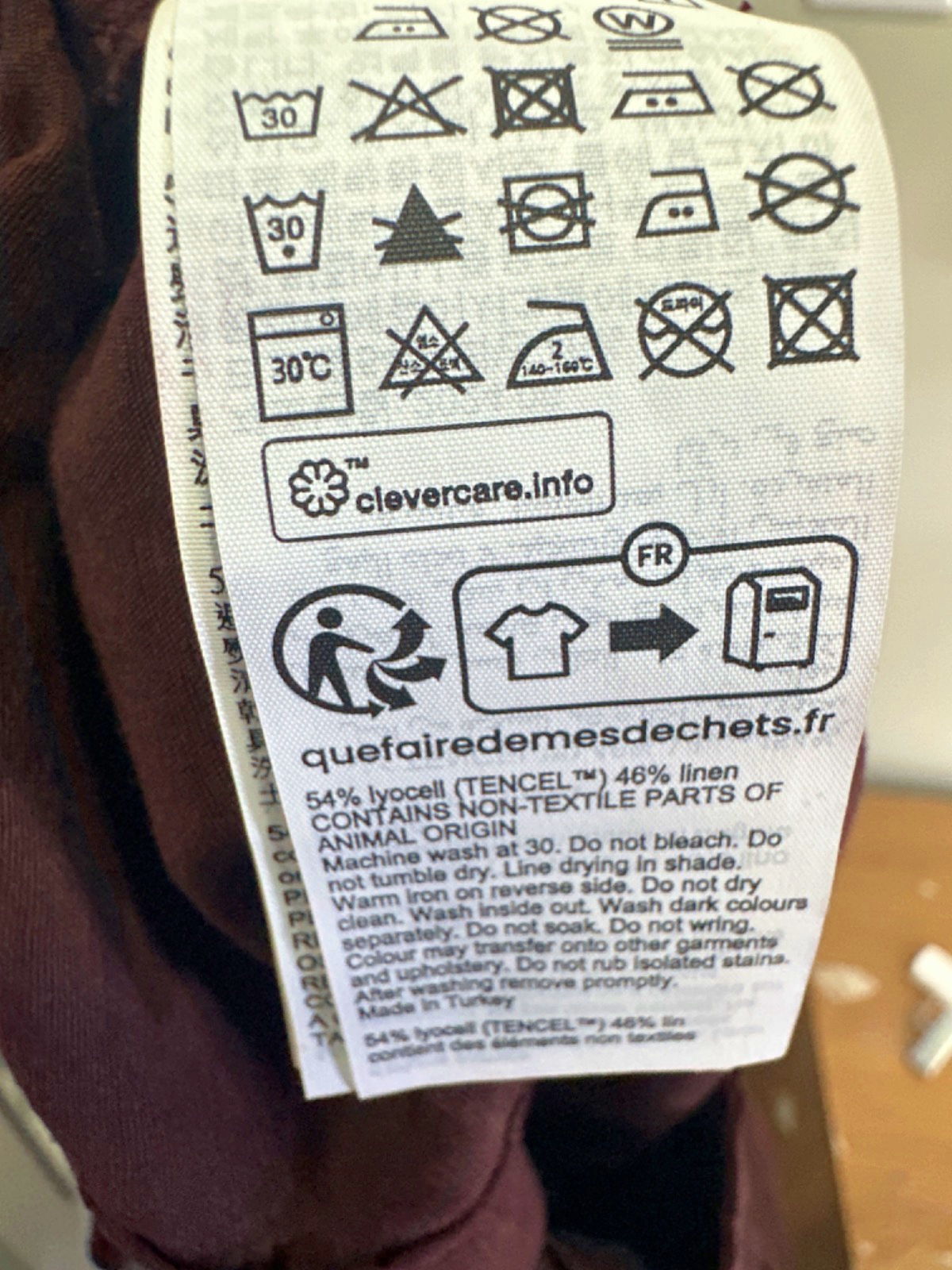 Materials: 54% Lyocell (Tencel), 46% Linen Contains non-textile parts of animal origin