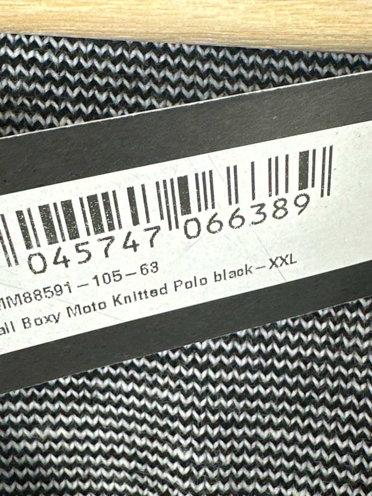 This is a stylish black knitted polo from boohooMAN, designed for a comfortable and casual fit. It features a boxy moto design and is perfect for layering or wearing on its own. Made with quality materials, this polo ensures both durability and style. Ideal for a chic yet relaxed look.