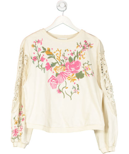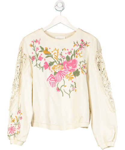 by Anthropologie Cream Oversize Floral Embroidered Lace Panel Sleeve Top UK S