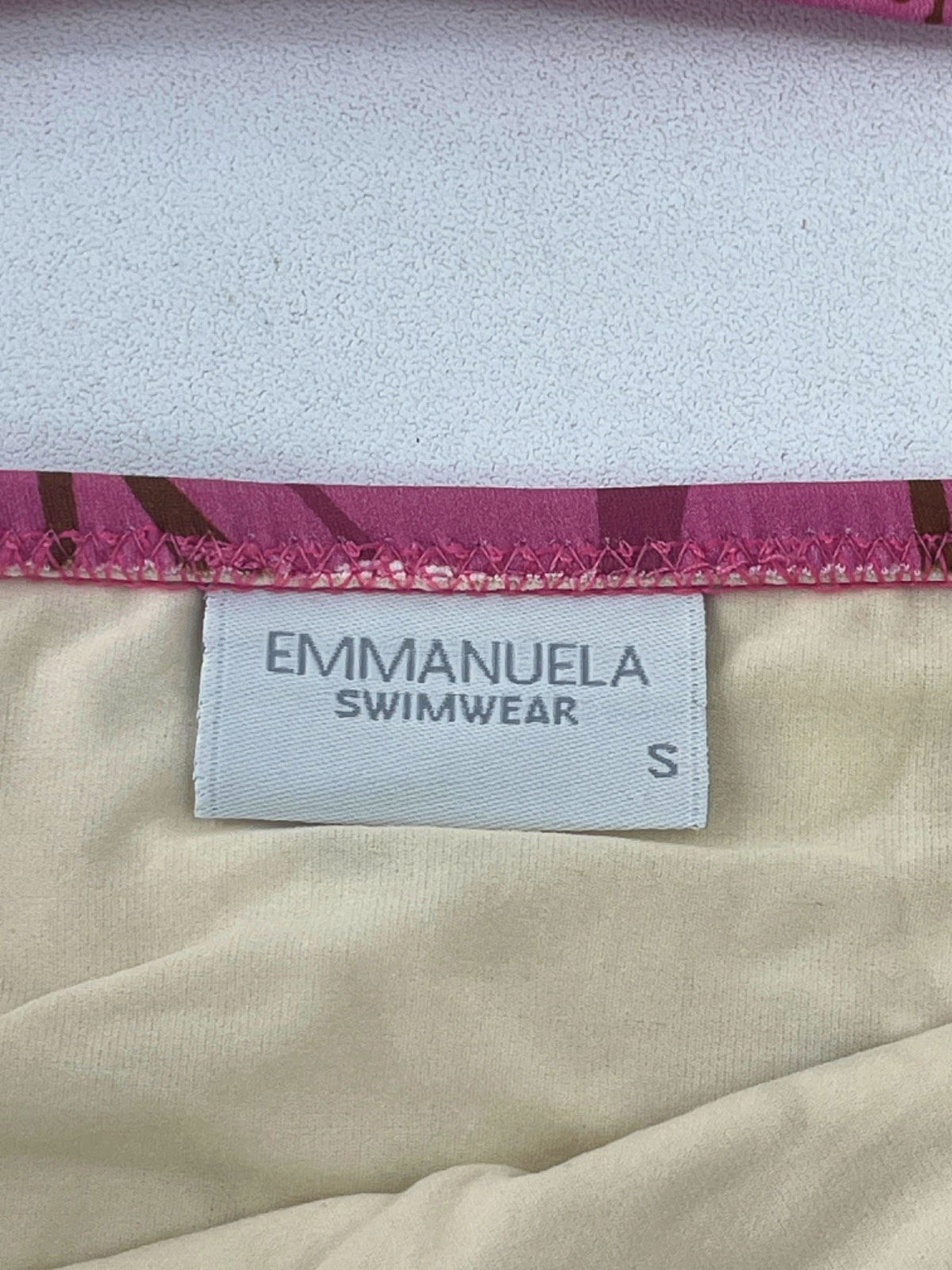 This charming Emmanuela bikini features a delicate floral print in an elegant pink hue. The design includes a trendy one-shoulder top with frill detailing and high-quality finishings. Perfect for a stylish day at the beach or by the pool.