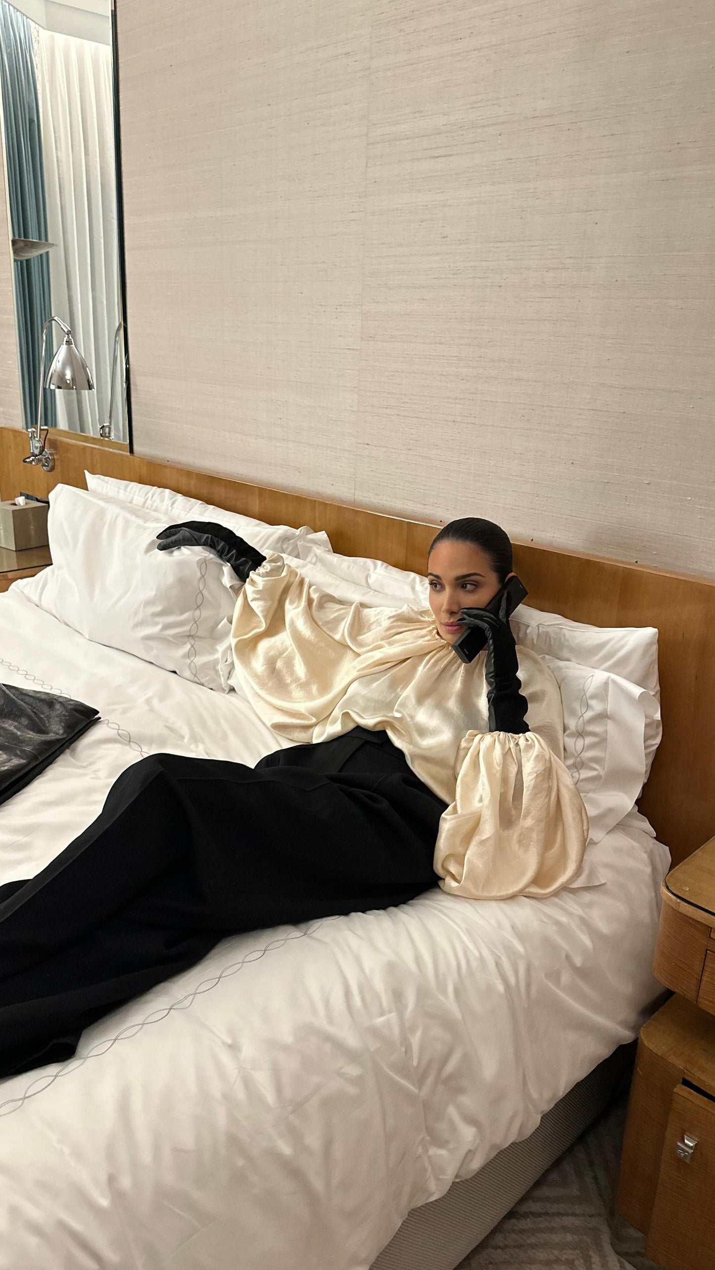 100% acetate - Studio Collection. Statement-making blouse in lustrous, softly draping twill with a crêpe finish. Features a round, gathered neckline with a slit and concealed button-and-loop fastener at the back of the neck. Extra-long, voluminous balloon sleeves with narrow elastication at the cuffs that causes them to fit snugly around the wrists, creating a pinched, bouffant look. One sleeve is also attached to both the front and back of the neckline, creating a pleat in the fabric that adds an asymmetric twist to this blouse’s eye-catching design.