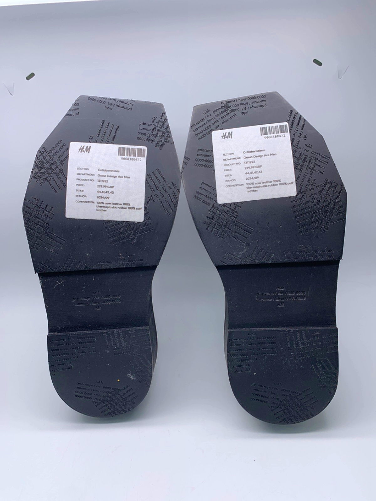 Step up your style game with these H&M Black Leather Platform Derby Shoes, designed in collaboration with a guest designer. Perfect for adding a touch of edge to your wardrobe, these shoes feature a durable leather upper and a unique thermoplastic rubber sole. Whether you're dressing up for a formal event or down for a casual outing, these shoes are versatile enough to complement any outfit.