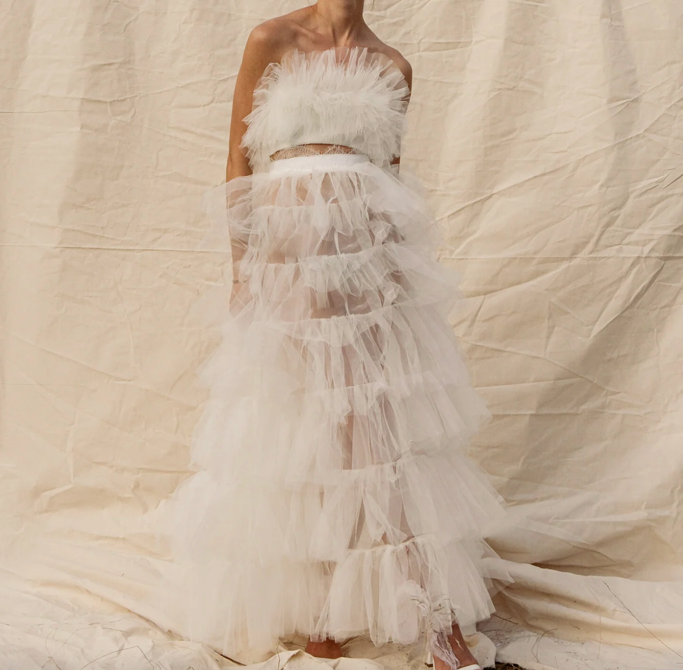 Jasmine French lace & soft tulle ruffle  strapless corset bralette & long skirt.