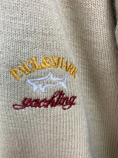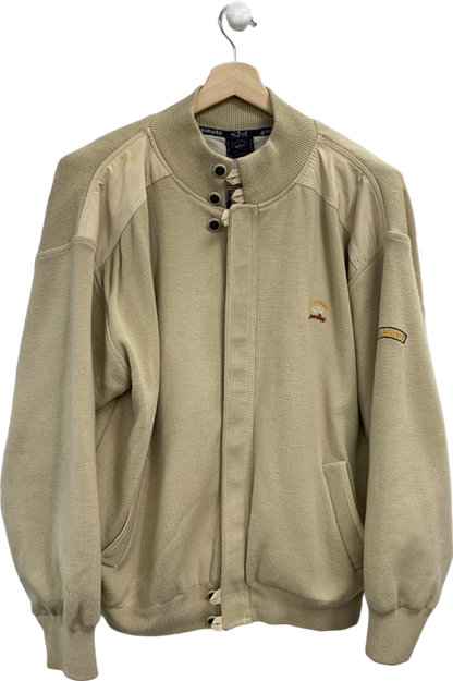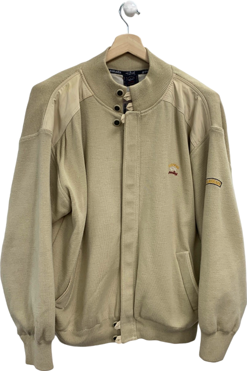 This Paul & Shark Yachting Jacket in beige is a stylish and comfortable outerwear piece designed for yacht enthusiasts. The jacket features a front zip closure, ribbed collar, cuffs, and hem for a snug fit. It has a subtle embroidered Paul & Shark logo on the chest and is made from high-quality materials for durability.