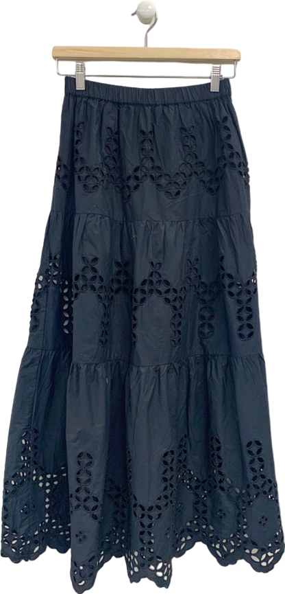 Elevate your wardrobe with this stunning River Island black maxi skirt, featuring intricate eyelet detailing that adds texture and elegance to the piece. Ideal for any season, this versatile skirt can be dressed up or down to suit any occasion. The elastic waistband ensures a comfortable fit, making it a must-have staple for your wardrobe.