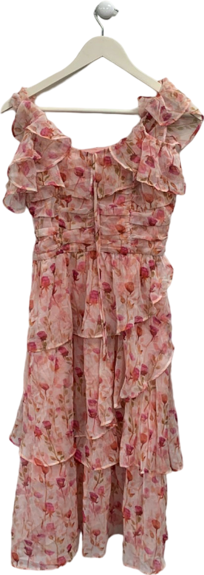 This Shein Pink Floral Ruffle Dress is a stunning piece, perfect for any occasion. Designed with a beautiful pink floral pattern, this dress features elegant ruffles, a cinched waist, and a layered skirt that adds a touch of romance and flair. The back of the dress is equally detailed with ruffles and a tie-up design, ensuring a flattering fit from all angles.