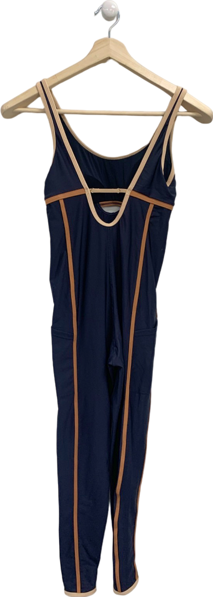 Gently pre-worn The Upside jumpsuit in navy with brown stripes. Designed in Australia and made in China, this trendy jumpsuit is perfect for activewear or casual outings. The high-quality fabric blend ensures comfort and durability.